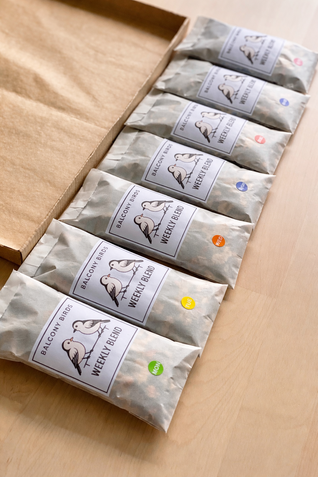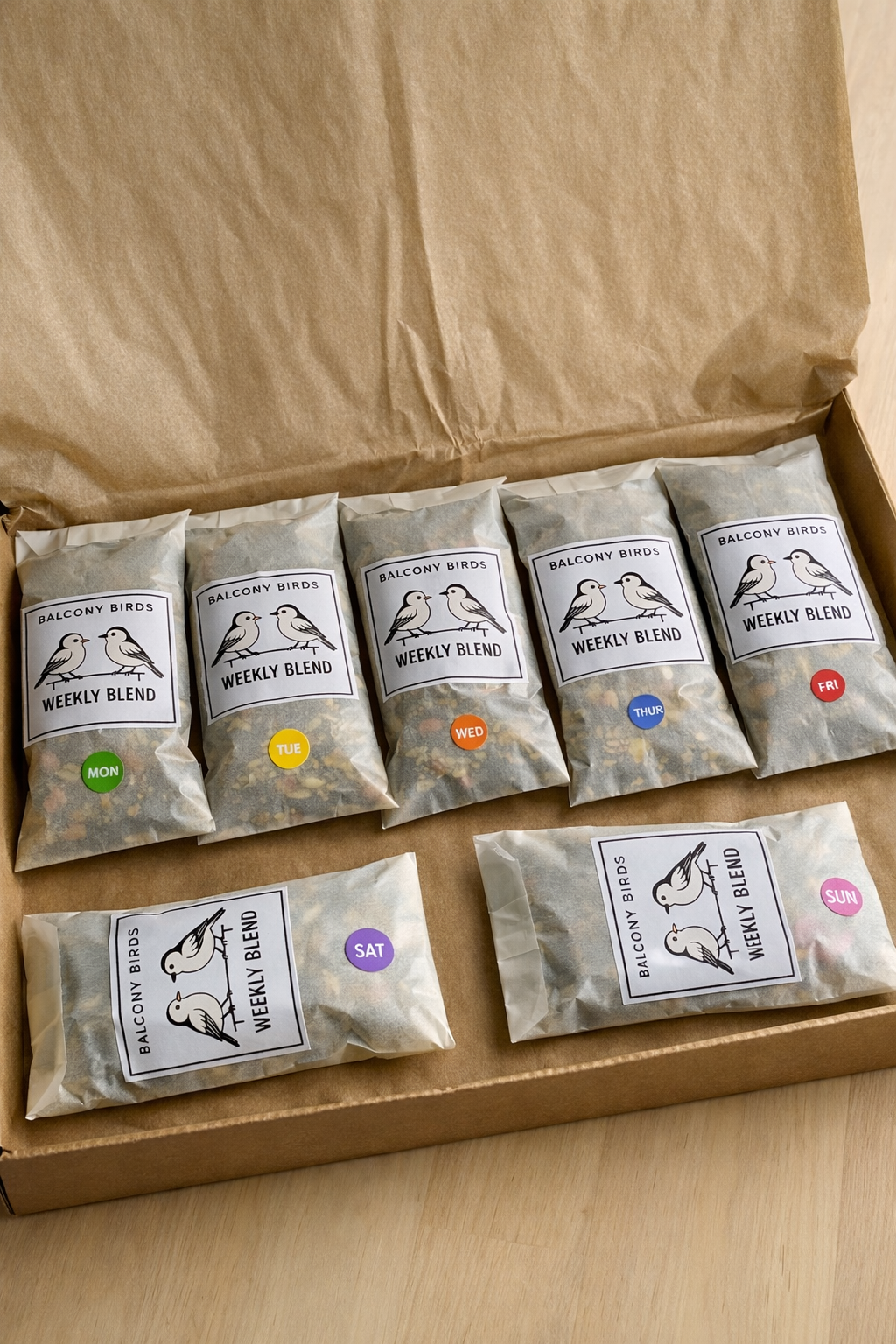 - ✔7 daily bird seed sachets (Mon–Sun)